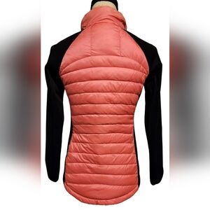 Fitted XS but will fit a Small as well. Pink "vest" part is thicker than the sleeves.