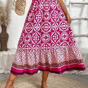 Hot Pink Boho Women's Colorblock Floral Print Ruffle Hem Skirt Maxi Outfit