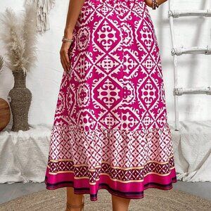 Hot Pink Boho Women's Colorblock Floral Print Ruffle Hem Skirt Maxi Outfit