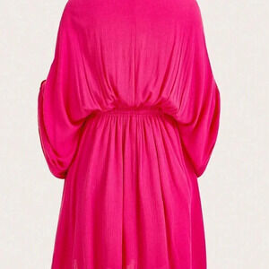 Hot Pink Boho Women's Deep V-Neck Floral Embroidered Batwing Sleeve Dress