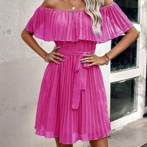 Hot Pink Casual Womens Off Shoulder Pleated Belted Dress