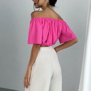 Hot Pink Casual Women's Off Shoulder V-Neckline Waisted Blouse