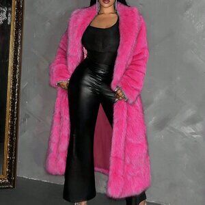 This stunning hot pink faux fur coat is perfect for making a statement this winter. It features a loose fit, lapel neck, and long sleeves for a comfortable and stylish wear. The knee-length design ensures a flattering silhouette.