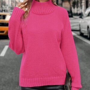 Hot Pink Casual Women's Stand Collar Raglan Sleeve Knit Pullover Sweater
