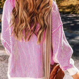 Hot Pink Casual Women's Striped Long Sleeved Round Neck Loose Pullover top