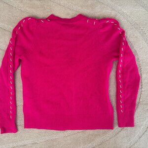 So soft and a fantastic statement piece! Great for the holidays. Hot pink cashmere with pearl buttons and pearls worked into the cables.