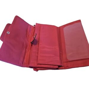 Includes multiple slip pockets, zipper pockets, and card holders. Snap closure.