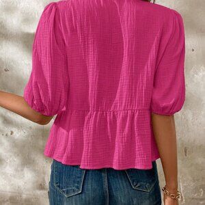 Hot Pink Cute Women's Tie Front Crop Top With Puff Sleeves & Ruffle Hem