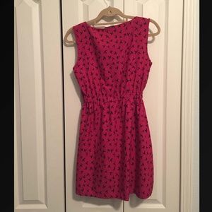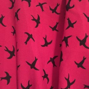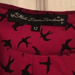 A cute youthful dress that is Fuschia with black birds on it. The dress is 100% polyester and is fairly thin. The tag says that the dress is a 12 but that is in UK sizing. The American sizing is a 6/8 The images do not quite represent the true color of the dress. The last image is the color that the dress appears in the current lighting I am in. The dress has been worn once or twice and is in excellent condition with no stains or other flaws.