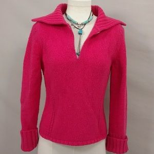Nice styling and great color on this 75 Merino wool 25 angora sweater by Express. Very soft knit, cute ribbed collar and wide cuffs. Deep v neck has a clasp to close if desired. Smaller at waist giving it a feminine fit. Marked L but runs small, please go by measurements. Knit has stretch. Length 23", bust flat 38", waist 33", hem 37". Condition very good, some light marks on cuffs, see close up. Spot clean or ignore! ( not very evident)