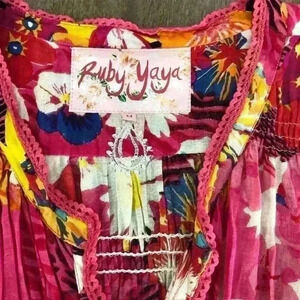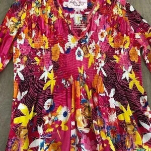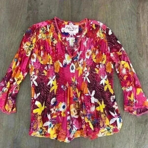 Hot Pink Floral Flare Sleeve Blouse V-Neck Size Medium