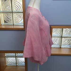 This made in Italy hot pink linen piece can be used as a jacket or worn as a top. The piece is from JS Millenium. It has a 3 button front closure, bell sleeves, flounce hemline, and ruffle v neckline. It is a one size with these approximate measurements: