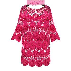 Hot Pink Open Knit Floral Sheer Cutouts Crochet Yarn Tunic Fuchsia See-Through