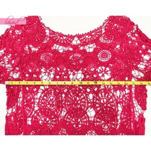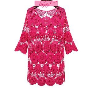 Open floral knit hot pink/fuchsia crochet tunic. Gently pre-owned. Throw on over your favorite tank, bandeau, bralette, or swimsuit! Boatneck. Half/quarter-length sleeves. Relaxed, easy fit. Dress up or down!