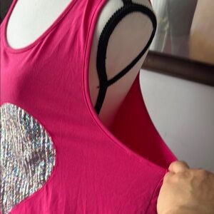 This vibrant pink tank top features an oversized fit with a dazzling silver sequin heart on the front. Its sleeveless design and soft fabric ensure comfort and style, making it ideal for casual wear. The scoop neckline adds a touch of relaxed elegance.
