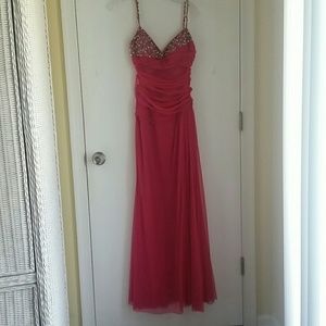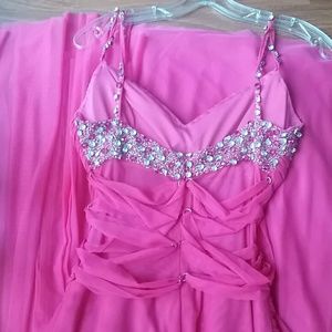 Goooorgeous dress perfect for prom! Jeweled bust and straps with sheer mesh/Tull middle. Two layers of Tull and one layer of polyester. Super light weight. Shell cups at bust. 60" total length from top of strap to bottom. 13" across bust. 11" across waist. Originally purchase from local boutique. Very recently dry cleaned.