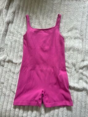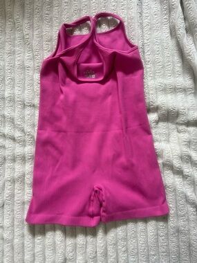 Soft ribbed one-piece in a vibrant hot pink. Comfortable stretch fabric for active play. Easy pull-on design with tank-style straps. Bright color keeps outfits fun and playful.