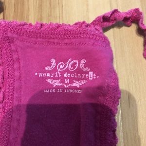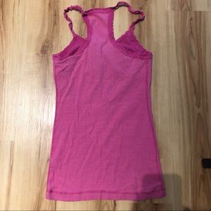 This hot pink ribbed razor back tank top is in good used condition. There are no noticeable holes or stains. The straps are a little twisted but it isn’t uncomfortable. There is a built in bra. It is a tight fitting top. Feel free to comment with questions.