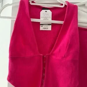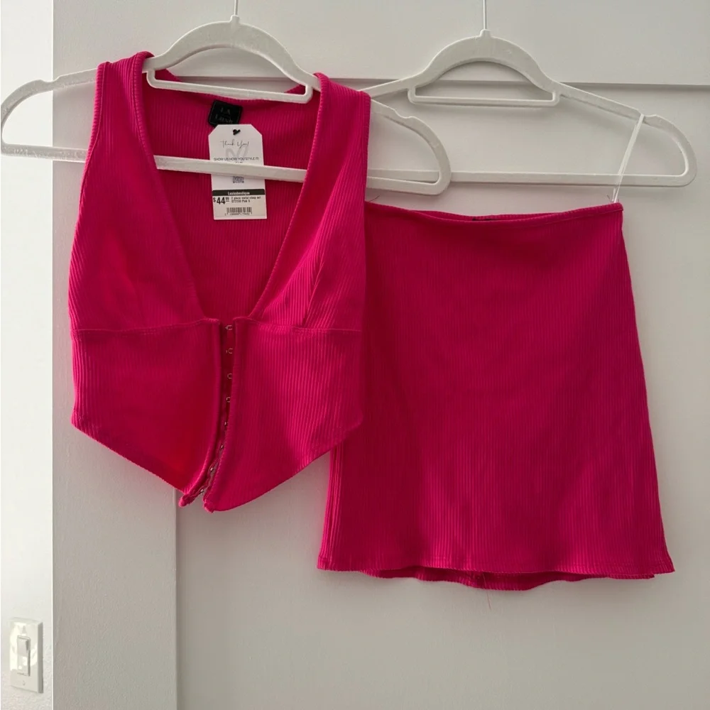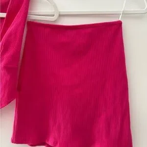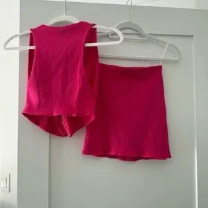 Stylish hot pink ribbed two-piece set. Includes a sleeveless top and matching skirt.