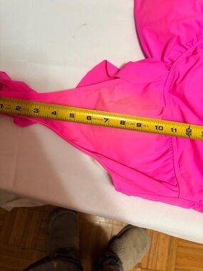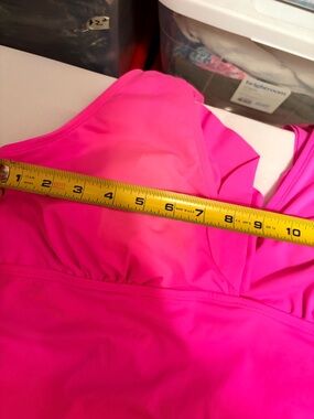 Vibrant hot pink tankini top with ruffle detailing at the straps and center front. Supportive underbust seam and flattering scoop hem. Smooth, stretchy swim fabric. Bright color that stands out.
