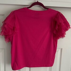 Brighten up your wardrobe with this vibrant hot pink ruffled tulle sleeve top. Perfect for any occasion, this shirt combines comfort and style effortlessly.