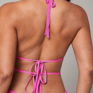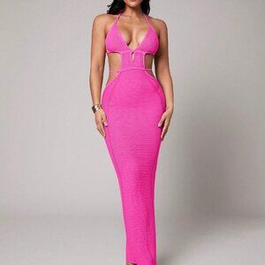 Hot Pink Sexy Women's Crochet Deep V-Neck Hollow Slit Mid-Length Dress