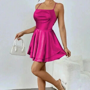 Hot Pink Sexy Women's Satin Backless Halter Neck Elegant Pleated Dress