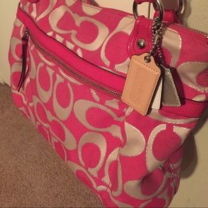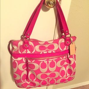 Hot pink color, patent leather handles, gently used, stored in dust bag. Tags still in interior pocket.