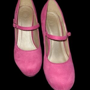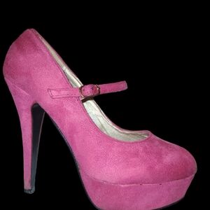 These Stilettos are FIRE! Hot pink suade with a strap and over 5 inches on the heel!!!! Size 8 and 1/2 Good used condition has some scuffs on the bottom see pics
