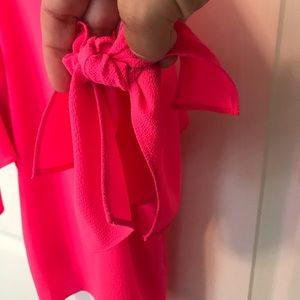 Hot pink top with open shoulders and tie sleeves. Button detail closure at top of neck. Made by London Times but purchased at Versona.