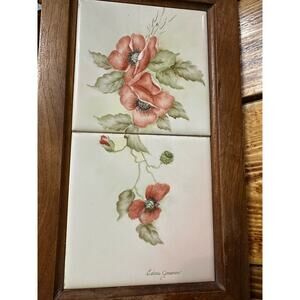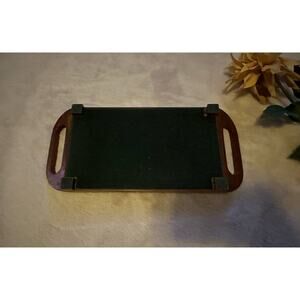 Vintage Wooden with tile insert hot plate trivet. The handles make it easy to carry your food to table. Felt on the bottom. Nice quality. 13 1/2” x 6 1/2”