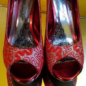 Gorgeous Ruby Red Lace and Silver Bling High Heels! The lovely Red Lace combined with the diamond like Bling of the silver and tiniest sequins sparkling through the lace, along with the metallic red heel is absolutely beautiful! These Ruby Red Lace and Bling High Heels will make you feel like you're ready to shine on the Red Carpet!