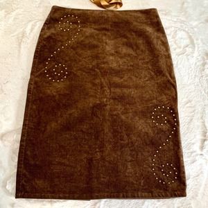 Hot Sauce Studded Corduroy Pencil Skirt Size Small. In excellent, pre-owned condition. A beautiful corduroy skirt in a deep brown color. Made of stretchy cotton and featuring antique gold studded embellishments on the front in a paisley print and a slit in the back.