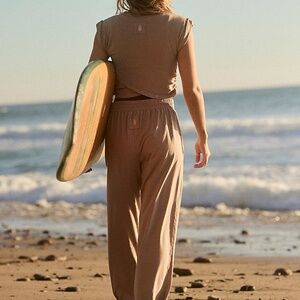 Features: Soft, jersey fabrication; relaxed fit; cropped muscle tee top with seaming detail; ankle length pant with high-rise waist and wide leg; elasticated waistband and cuffs; crossover detail on top; ribbed collar; side seam pockets