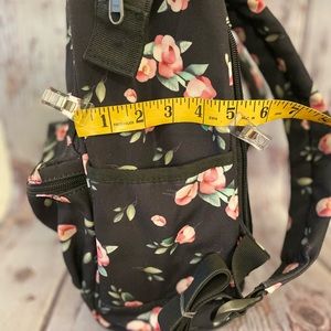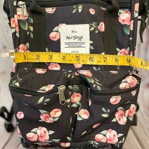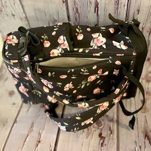 Gently used and kept clean. 10 pockets total! Medium size measurements shown in pictures. Black with pink roses print on easy clean up fabric. Light weight with adjustable shoulder straps. Handles at the top opening. There is an inside padded pocket for small laptops or tablets. Smoke free home.
