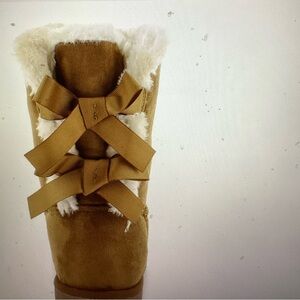 Stylish ankle boots with soft fur trim. Features decorative bows on the side. Perfect for cozy wear.