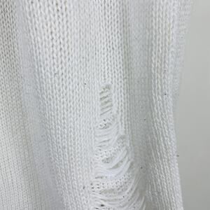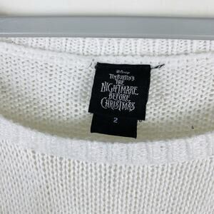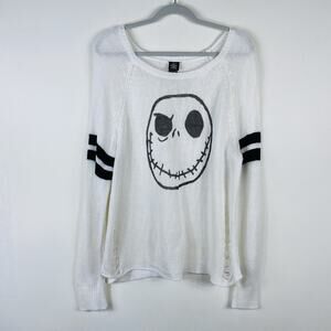 White knit sweater from The Nightmare Before Christmas with a smirking Jack Skellington face design on front. Black knit stripes on sleeves. Destructed details.