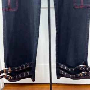 These black denim carpenter pants have red contrast stitching throughout, side cargo pockets and grommet buckles at the ankles.
