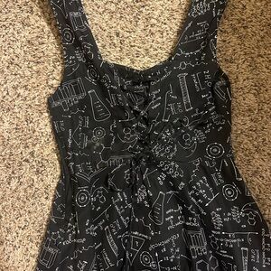 Chic mini dress with science-themed print. Sleeveless design. Perfect for casual outings.
