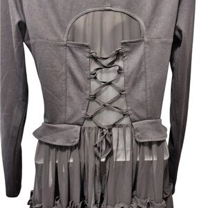 I can't think of a better way to cover up than this jacket! The black double-breasted jacket has a sweetheart neckline with a high ruffled collar and adjustable lace-up back to really give you the silhouette you crave. Imagine how bad-ass you'll look with the sheer tiered ruffle skirt blowing behind you while you stroll down the street. Get it. Snap front closure. Steampunk/Emo/Goth