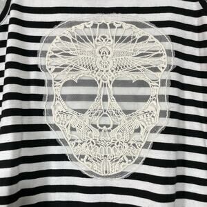 Women's casual tank top by Hot Topic. This black and white striped top has a lace sugar skull applique on the front, a scoop neck, and a high low hem. It is a polyester, rayon, spandex blend.