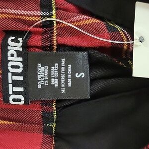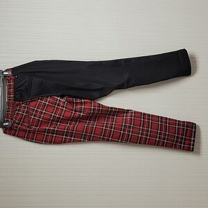 These striking pants from Hot Topic feature a unique split design with one side in solid black and the other in a bold red and black plaid pattern. women's sz small. 85 % polyester, 13% rayon, 2% spandex. 11" rise, 26" waist (waist is stretchy), 29" inseam
