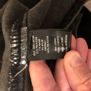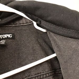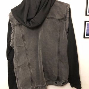 The main body of the jacket is a lighter black denim. The hoodie and the arms are dark black and made of a softer hoodie material. The hoodie has buttons and can be detached from the jacket.