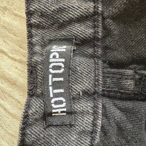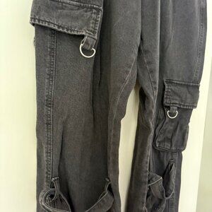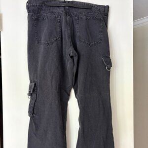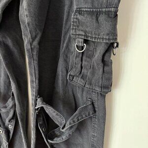 Grunge/punk style Hot Topic brand black baggy denim with cargo pockets. straps, buckles. In vintage condition. 100% cotton.