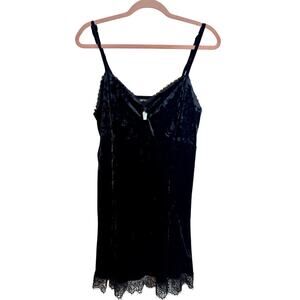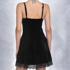 Excellent condition. Soft crushed black velvet with lace trim and a gold coffin charm at the neckline. Adjustable straps, mini length, perfect for layering with sheer tights and boots. True goth grunge energy with NYE party vibes or everyday alt-style wear.