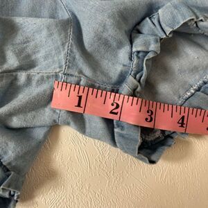 Adorable Hot Topic denim overall romper with embroidered details. Features a light wash chambray look with whimsical mushroom embroidery on the chest pocket and floral embroidery on the legs. Ruffled straps and hems add a cute, feminine touch. Perfect for cottagecore, festival, or casual summer style.