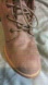 (Taupe is a color between tan and gray; the plaid cuffs are blue and tan. The booties have functional thistle buttons on each side of both booties.)