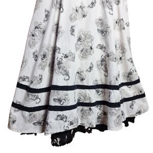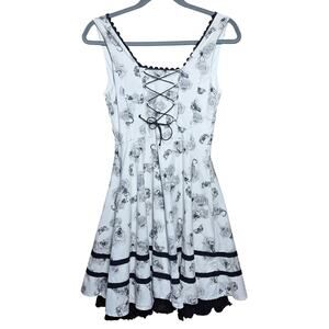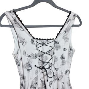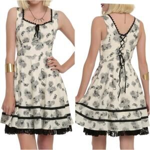 white milkmaid style tank swing dress with black floral roses insect bug spider scorpion print and sexy lace up corset style back and bow tie neckline detail