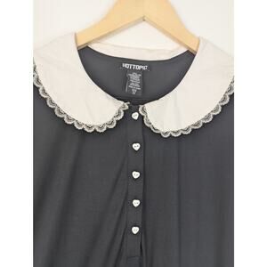 Hot Topic Goth Black Lace Peter Pan Collar Mini Dress. Short sleeves with lace trim, heart buttons, pockets.