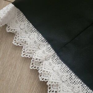 Black pleated miniskirt with white lace details at the hem. Very cute and perfect way to give personality to any look! Worn lightly, in perfect condition. Zip and clasp back. Polyester and rayon material.